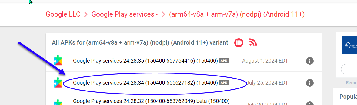 The final file to download is the Google Play Services APK file. This file will need to be selected from a number of files displayed. There will not be a single, clear download button. You will need to select the APK file that is closest to the top of the list, and it MUST NOT say "beta" in its title. You'll click on the APK File name, which opens up to the APK file download page.