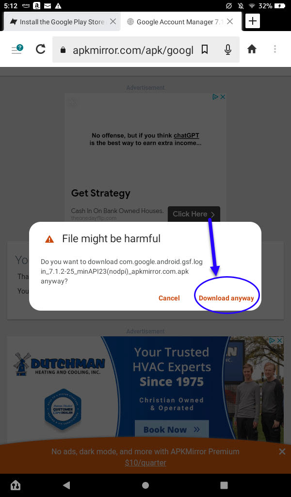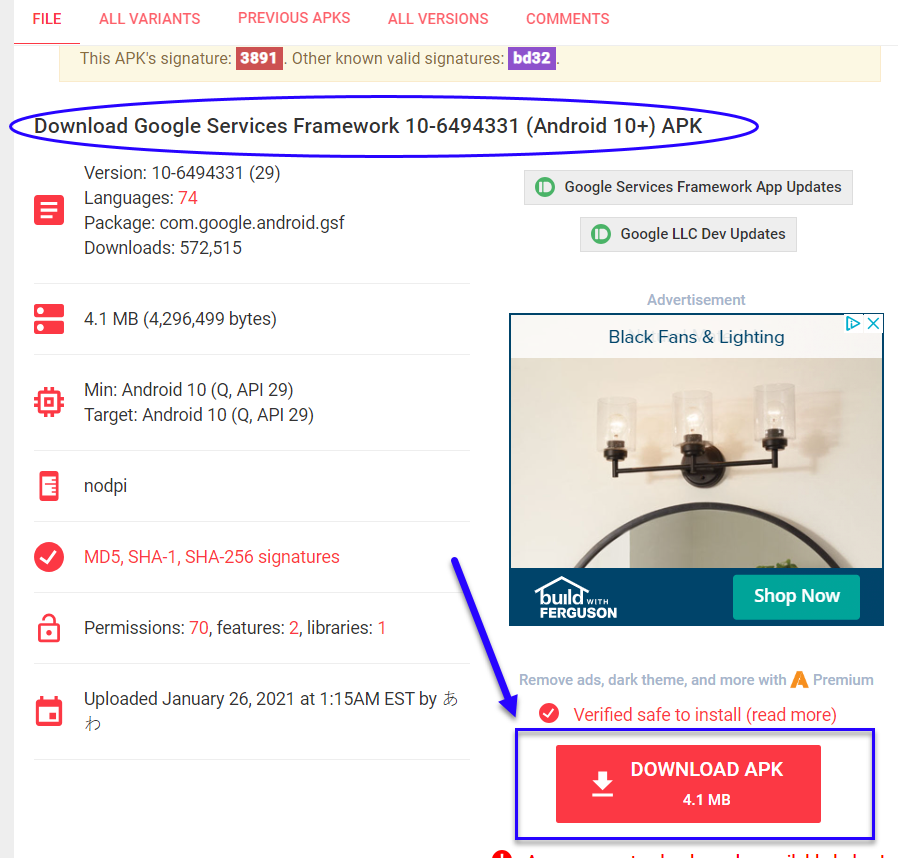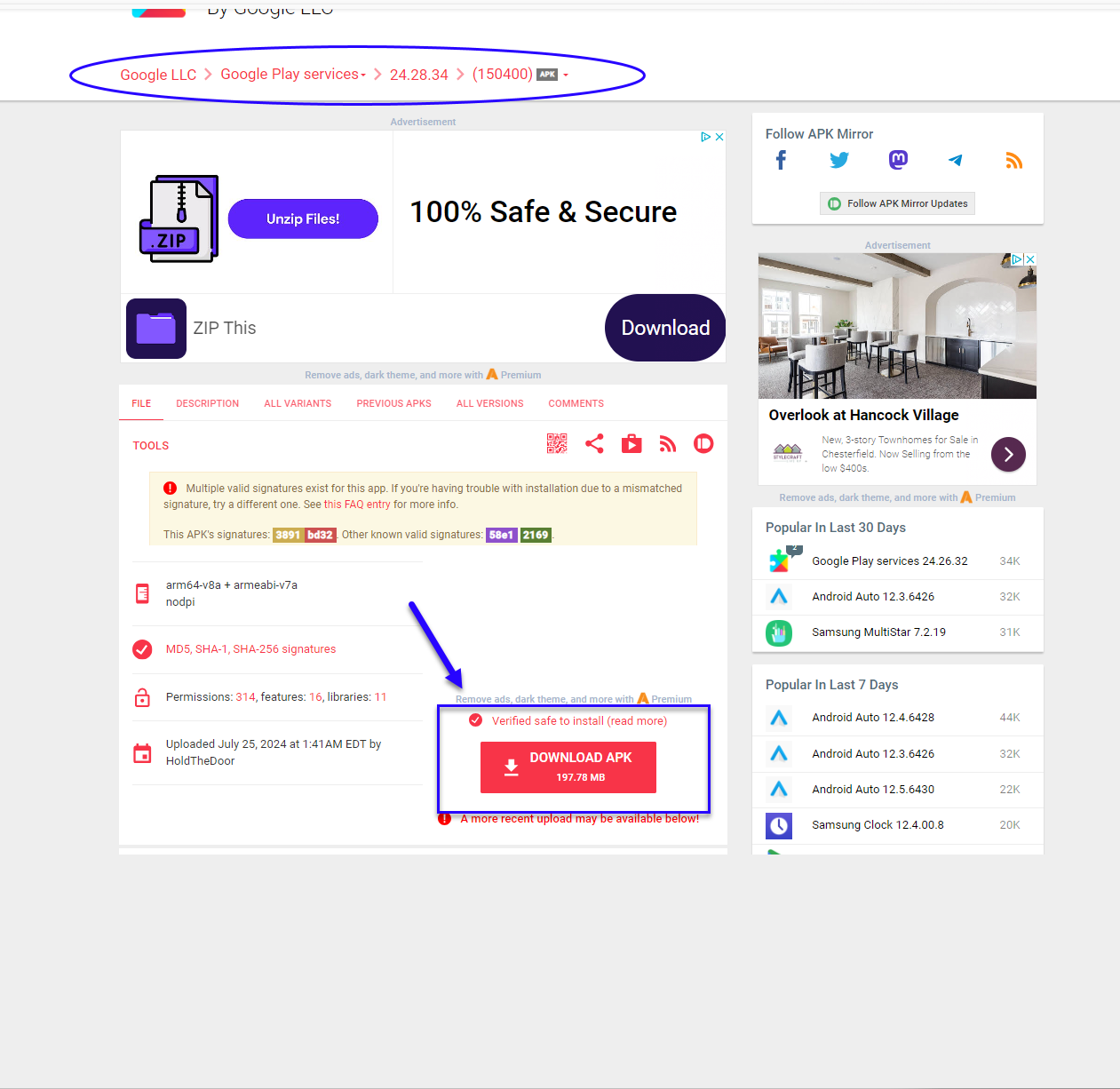 The APK Mirror website is a reliable and trustworthy site for downloading APK files. However, the ads on the page are pretty deceptive, and it's easy to click the wrong button. There will also be popups that open, just close them. However, make sure you click the button that says Download APK . If you go slow, you'll find it very easy to download the four files.